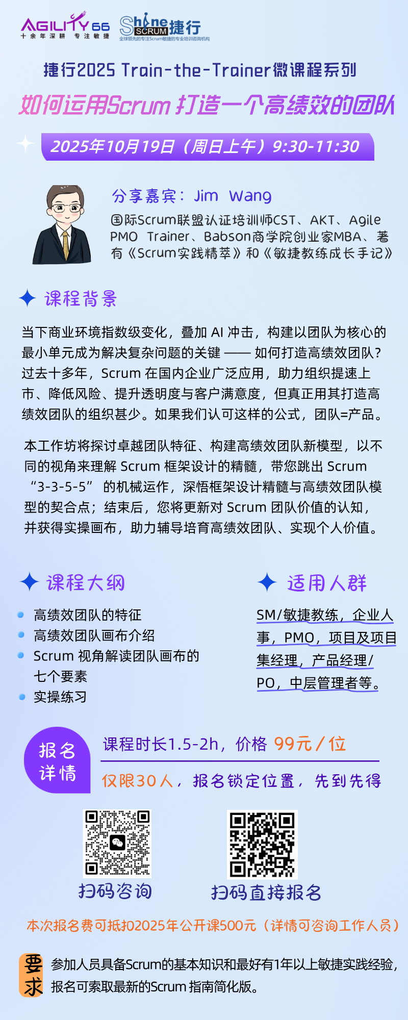 在工作坊结束时,提升你对Scrum及其团队层面价值的全新认知,并以一个可实操的画布为起点,帮助你在工作中辅导和培育,打造一个走向更高的绩效团队,实现个人价值。
