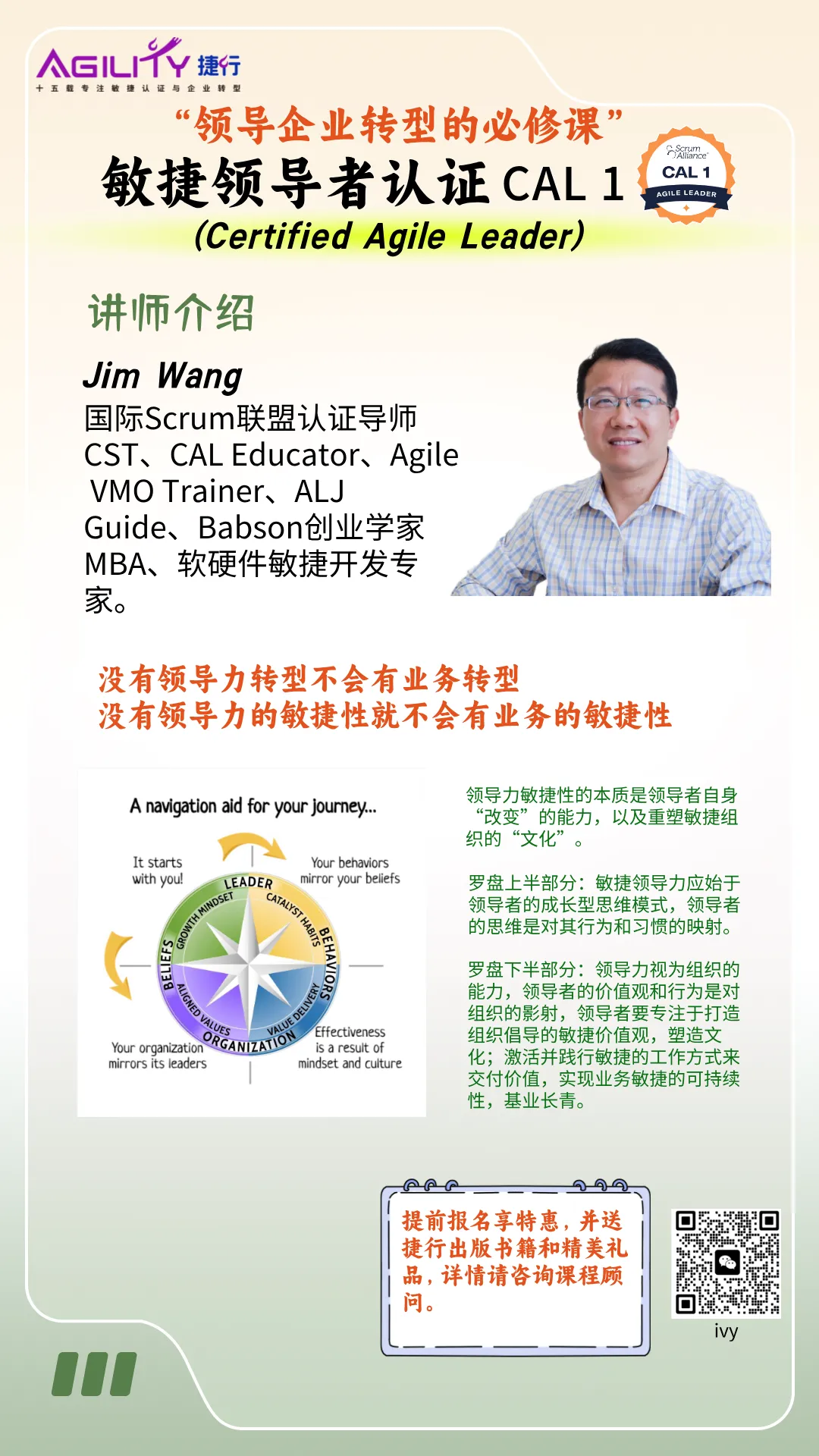 • 敏捷领导力CAL1 认证:夯实敏捷领导力根基,掌握以使命驱动变革的核心思维,成为组织变革的引领者。