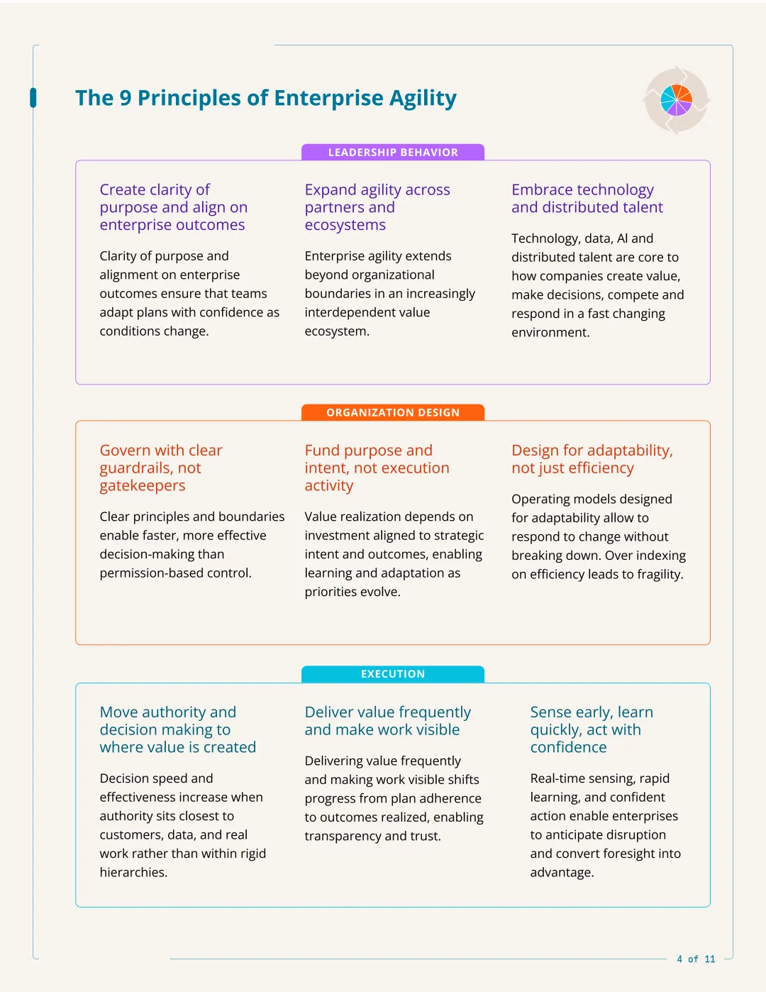 具备敏捷能力的企业,会通过提前感知潜在变化、高效做出关键决策、跨职能与层级灵活调配资源,构建组织的变革适应力。并通过持续创新、模式重构与人才培养,实现可持续增长。这些核心能力,在使命驱动的领导力与自适应运营模式的支撑下不断强化,帮助企业抓住机遇,为客户持续创造价值。