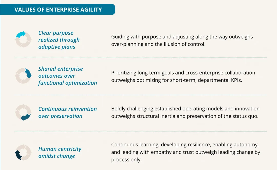 《企业敏捷宣言》 正是通过一套共通的价值观与原则,帮助领导者锚定目标、权衡取舍,让拥抱变革成为组织的核心优势,从而指导他们应对当下的各项决策。