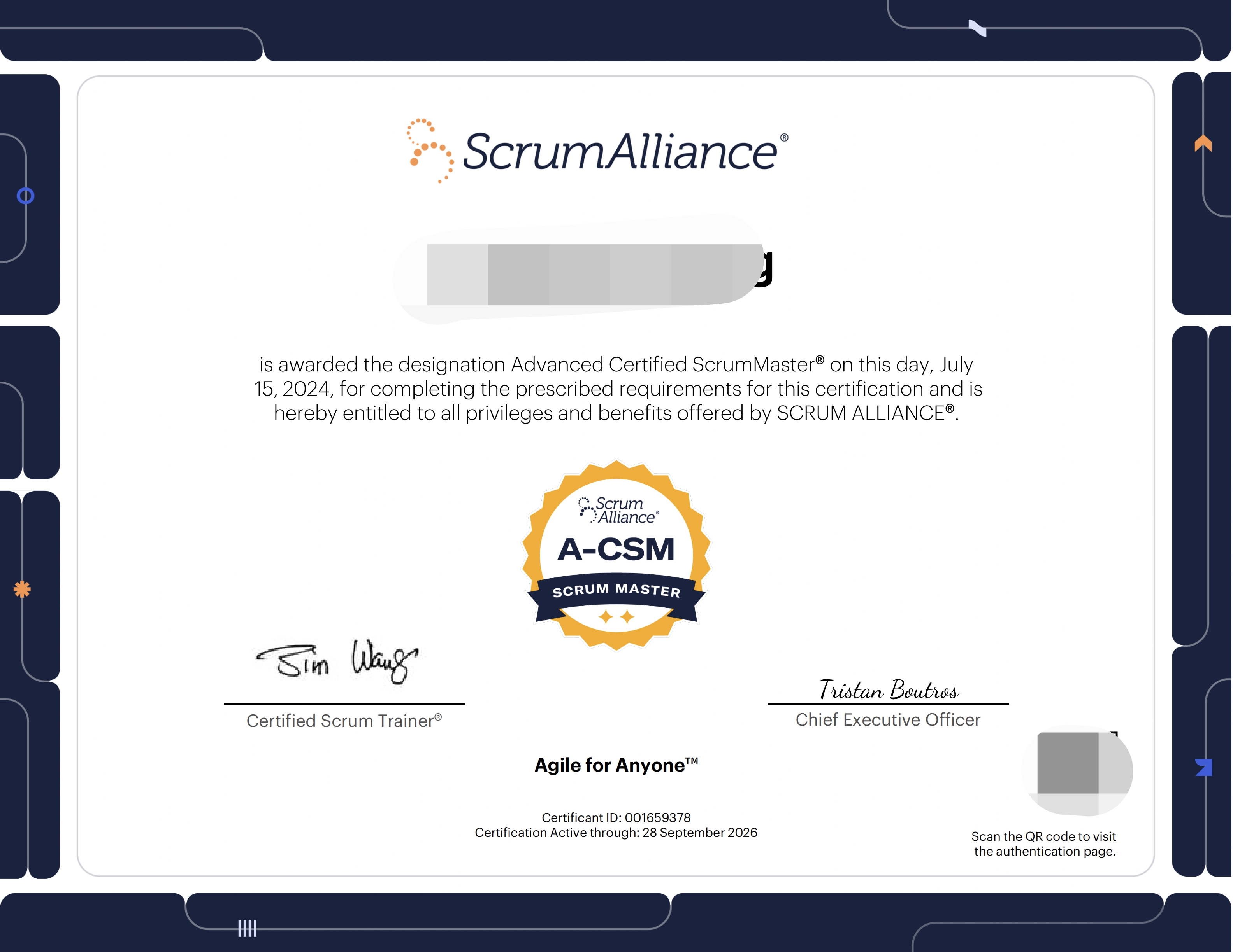 l 接受A-CSM许可协议,并填写您的Scrum Alliance成员资料。